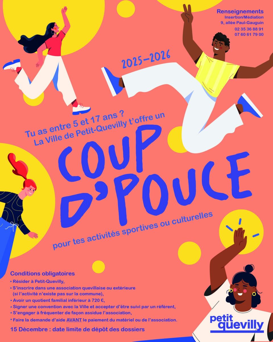 ➡️ Coup d’pouce est une aide financière pour les jeunes Quevillais de 5 à 17 ans qui souhaitent intégrer un club sportif, une association culturelle ou de loisirs. 👍