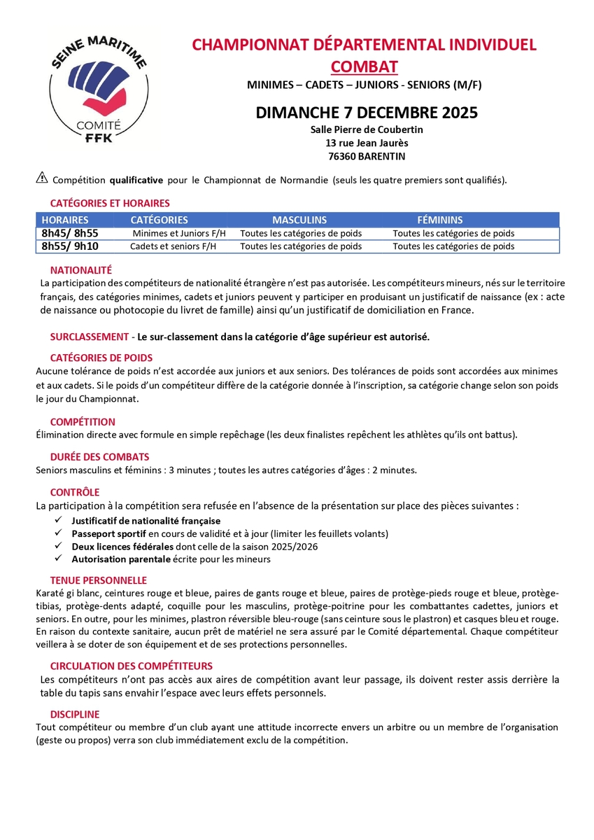 Programme Championnat départemental de Karaté Combat